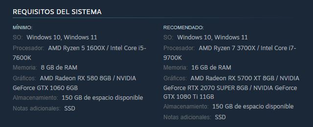 Saltamos a la tarjeta gráfica, componente clave, para ver que pide una RX 580 de 8GB de AMD o una GTX 1060 de 6GB de Nvidia. Son gráficas de hace años también y cualquier tarjeta gráfica actual las supera holgadamente en potencia. Te pide Windows 10 o Windows 11 como sistema operativo y aquí no especifica si solo se puede jugar en DirectX 12, aunque suponemos que así es.